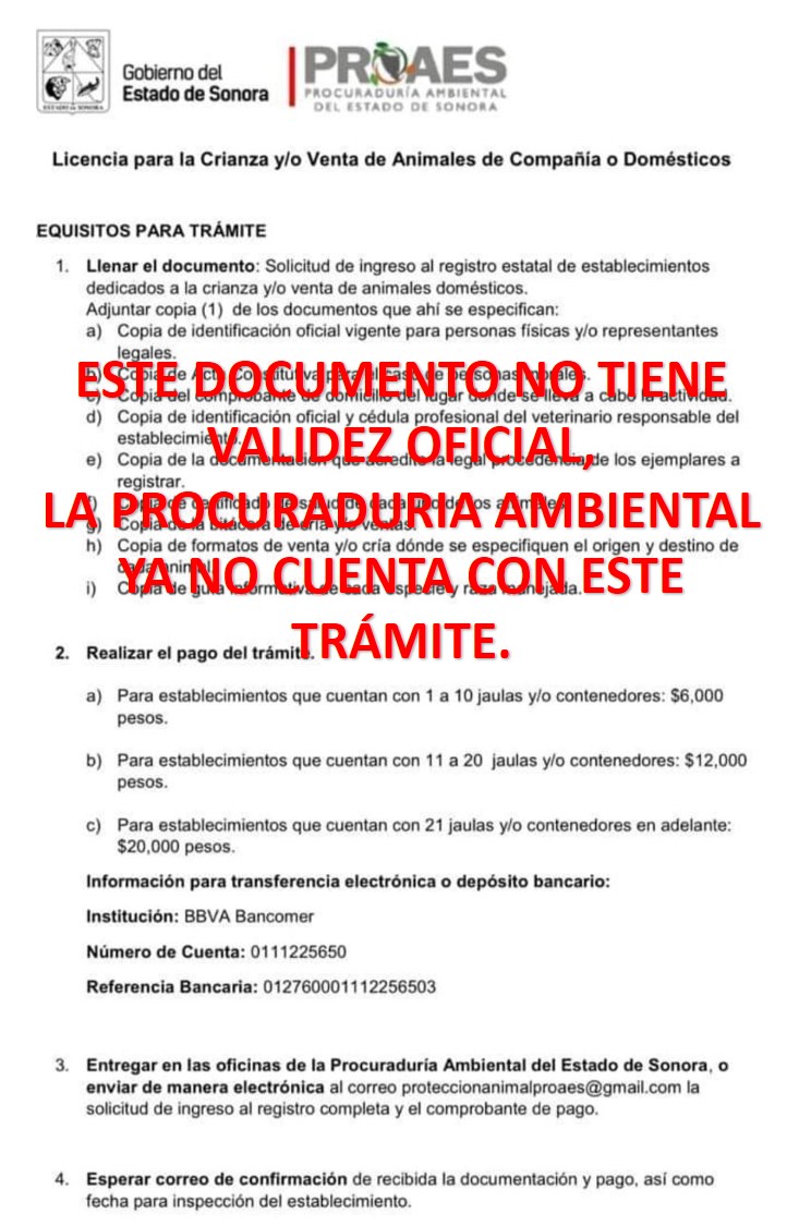 Se hace de su conocimiento que partiendo de la publicación en el Boletín Oficial el día Jueves 12 de septiembre de 2024, de la Ley número 02, de Protección Bienestar Animal para el Estado de Sonora, el trámite de Licencia para la Crianza y/o Venta de Animales de Compañía o Domésticos ya NO es atribución de esta Procuraduría Ambiental, por lo cual, la información publicada sobre los requisitos para su gestión ha de considerarse obsoleta.